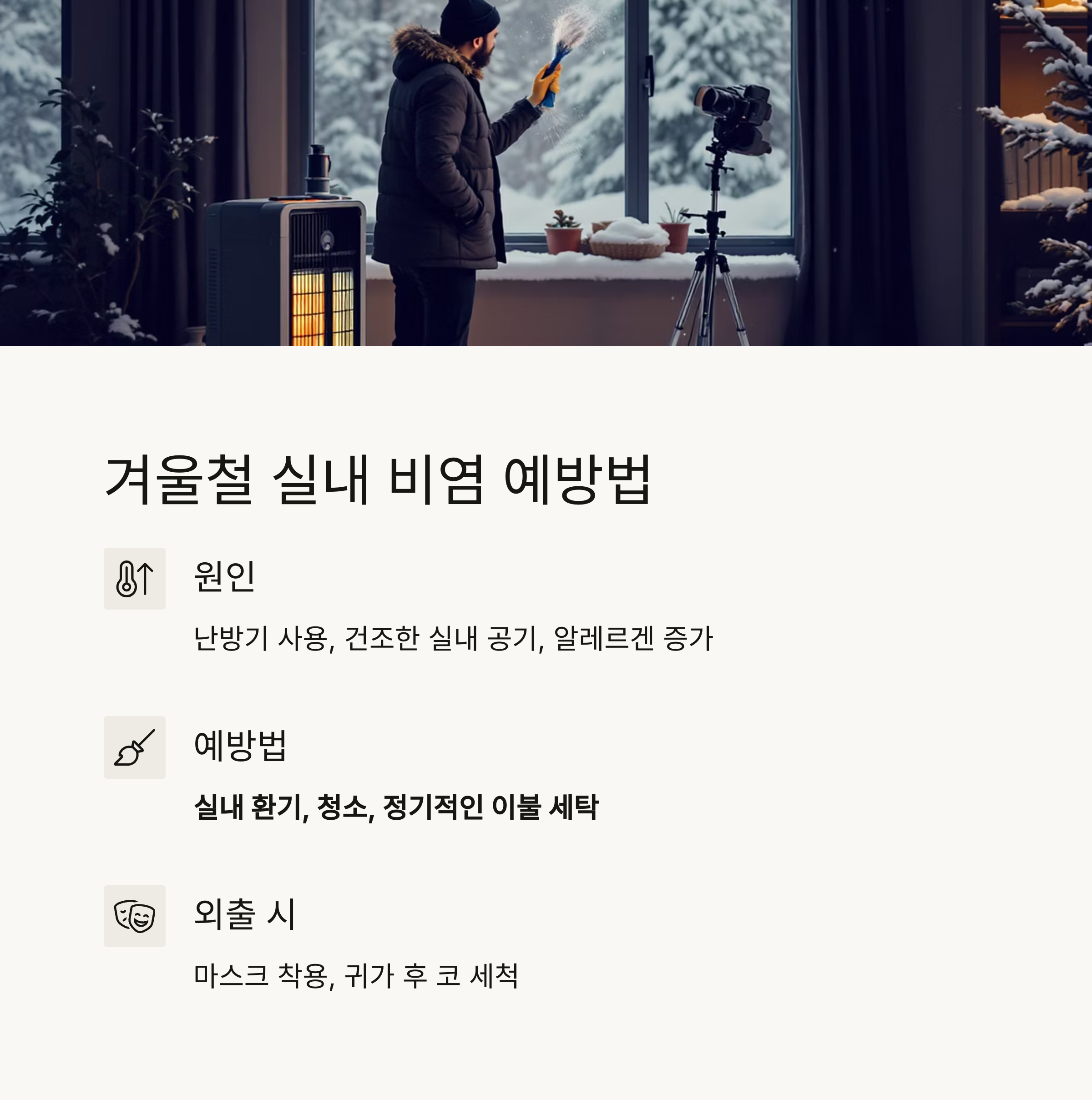 | 겨울 | 난방, 실내 알레르겐 | 재채기, 콧물 | 실내청소, 공기환기 |
