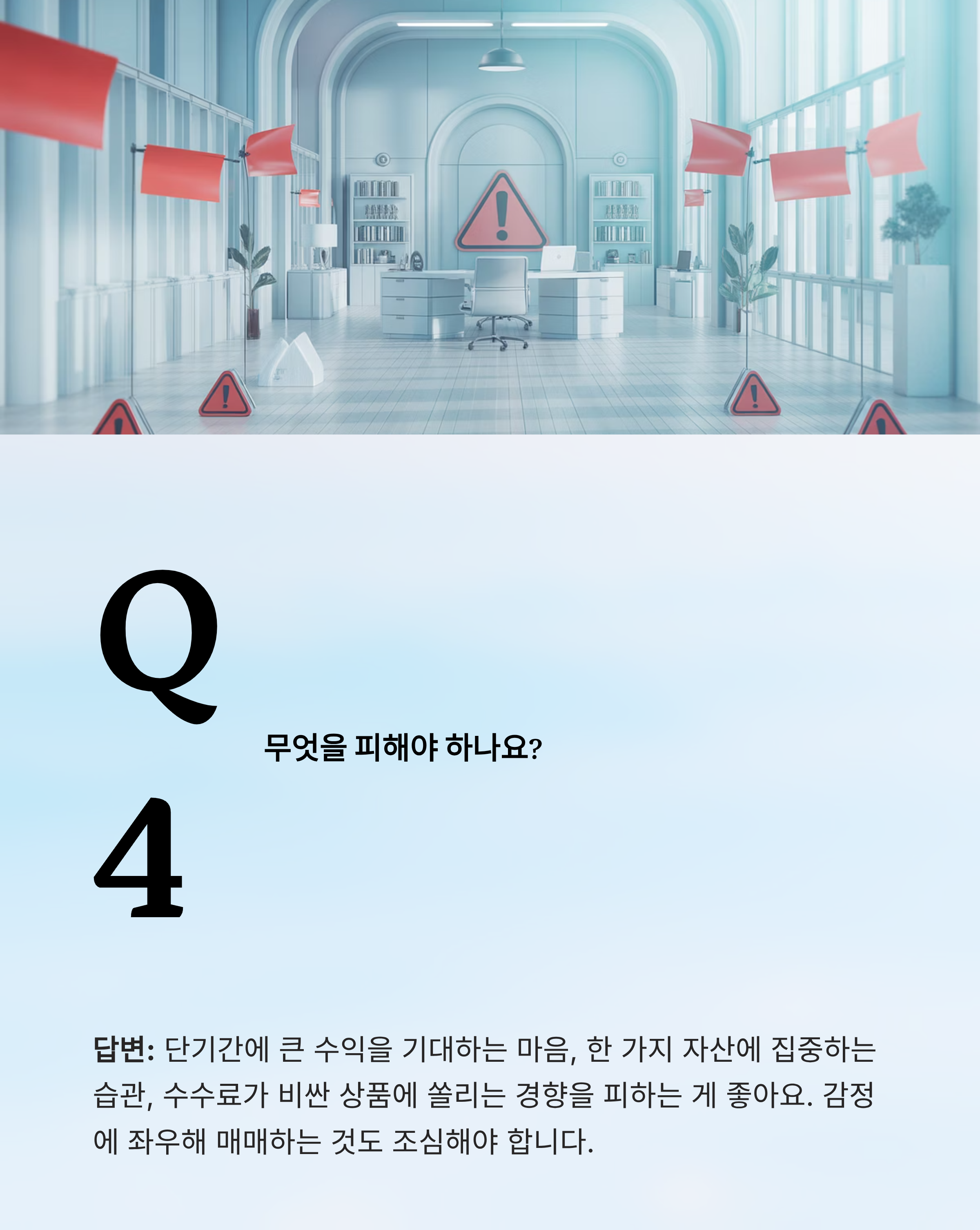 답변: 단기간에 큰 수익을 기대하는 마음, 한 가지 자산에 집중하는 습관, 수수료가 비싼 상품에 쏠리는 경향을 피하는 게 좋아요. 감정에 좌우해 매매하는 것도 조심해야 합니다.