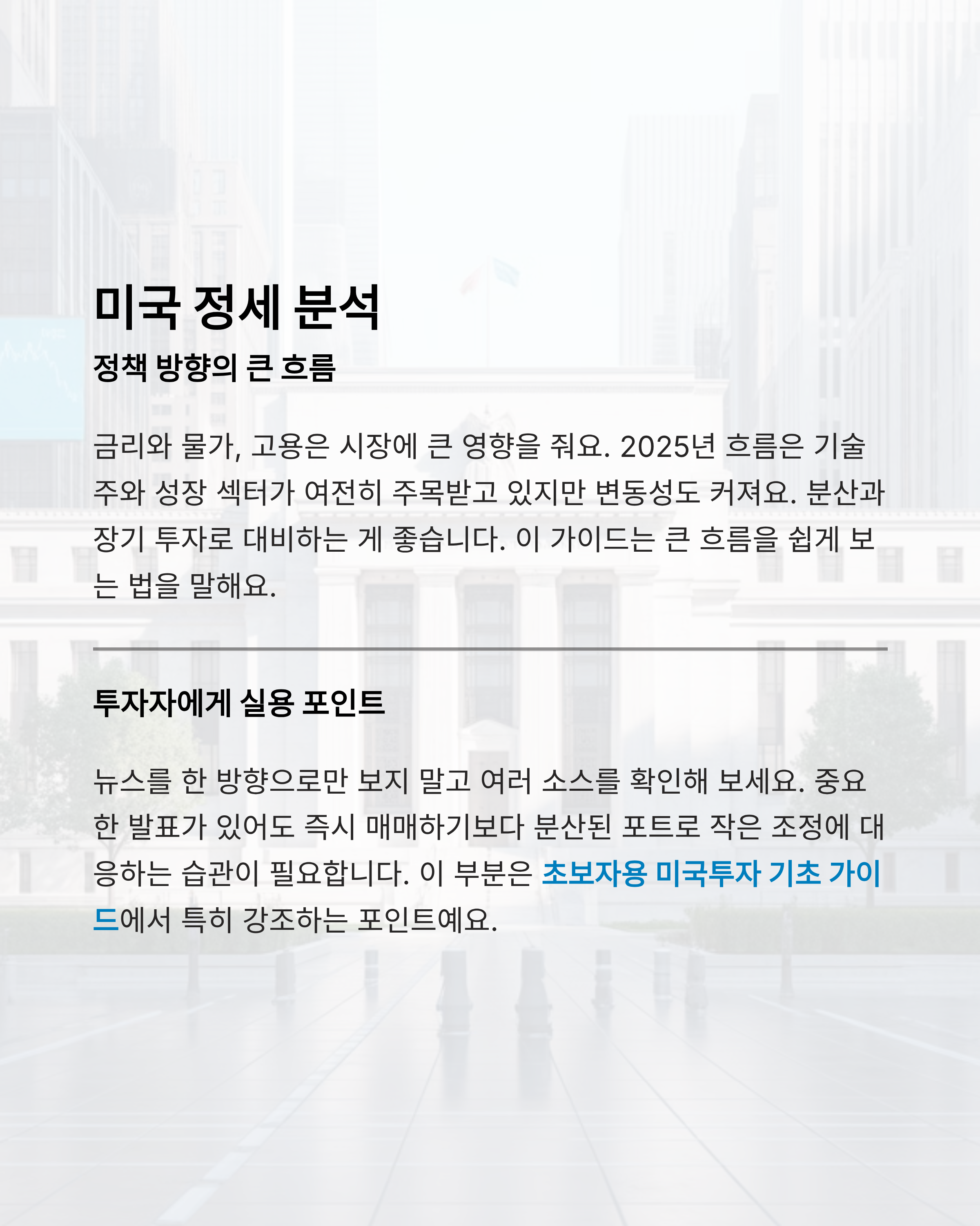 뉴스를 한 방향으로만 보지 말고 여러 소스를 확인해 보세요. 중요한 발표가 있어도 즉시 매매하기보다 분산된 포트로 작은 조정에 대응하는 습관이 필요합니다. 이 부분은 초보자용 미국투자 기초 가이드에서 특히 강조하는 포인트예요.