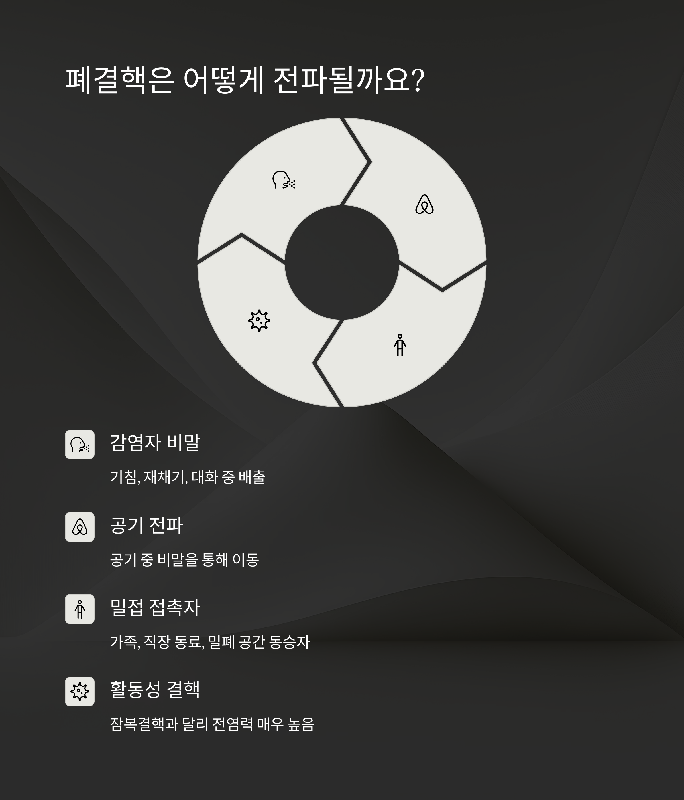 폐결핵은 공기 중으로 퍼지는 비말을 통해 전파됩니다.