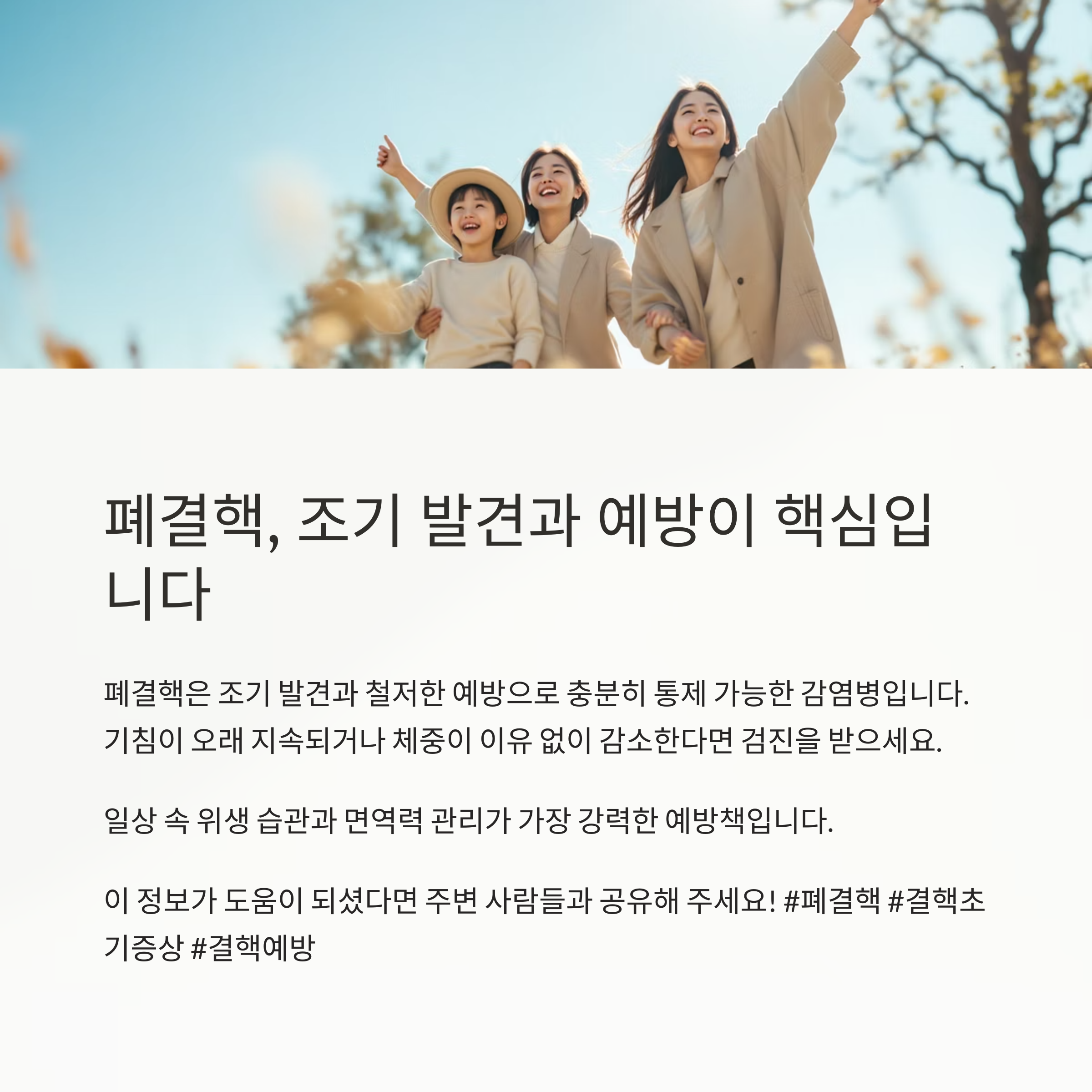 폐결핵은 조기 발견과 철저한 예방으로 충분히 통제 가능한 감염병입니다.