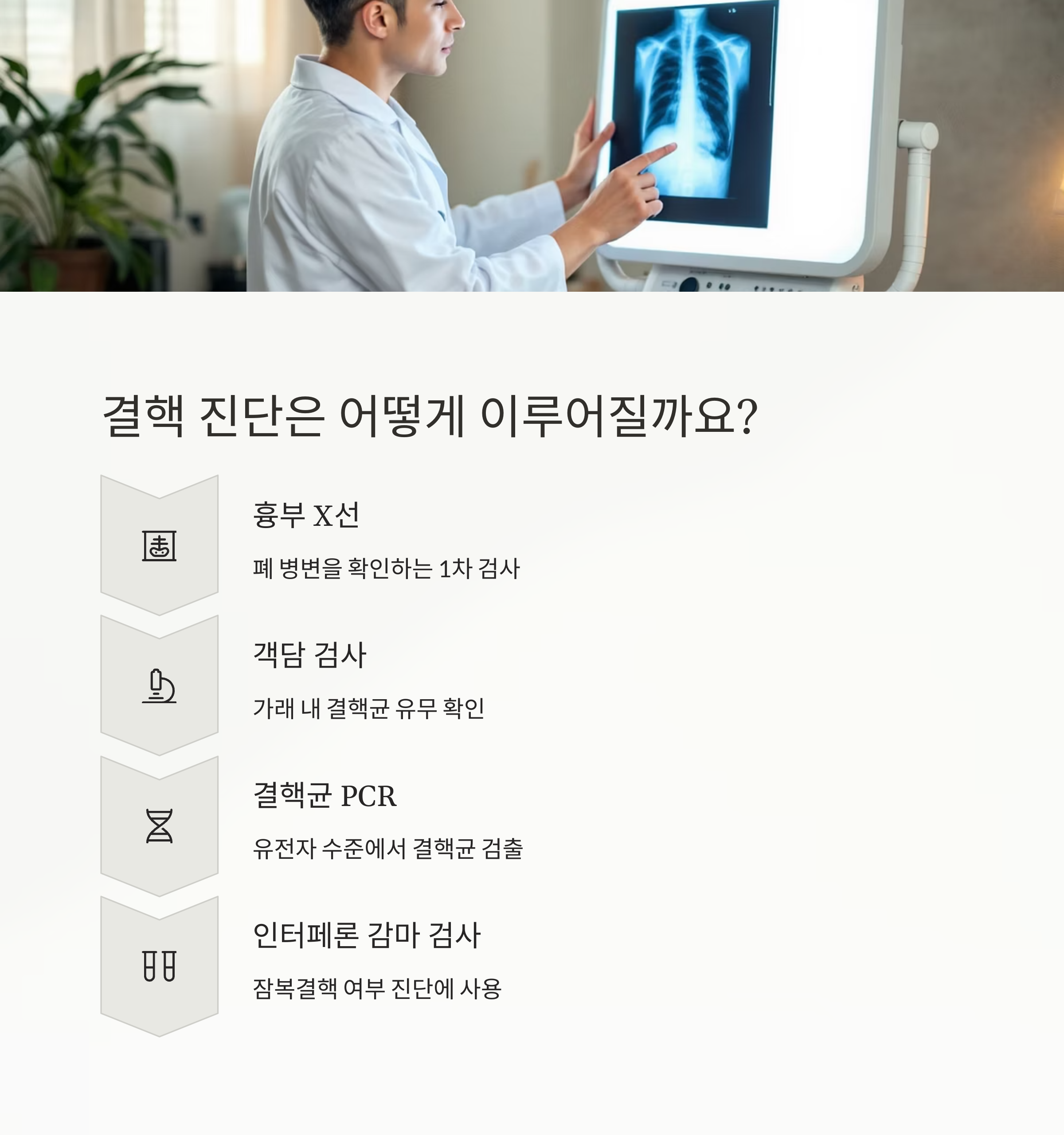 결핵이 의심되면 병원에서는 다음과 같은 검사를 진행합니다:
