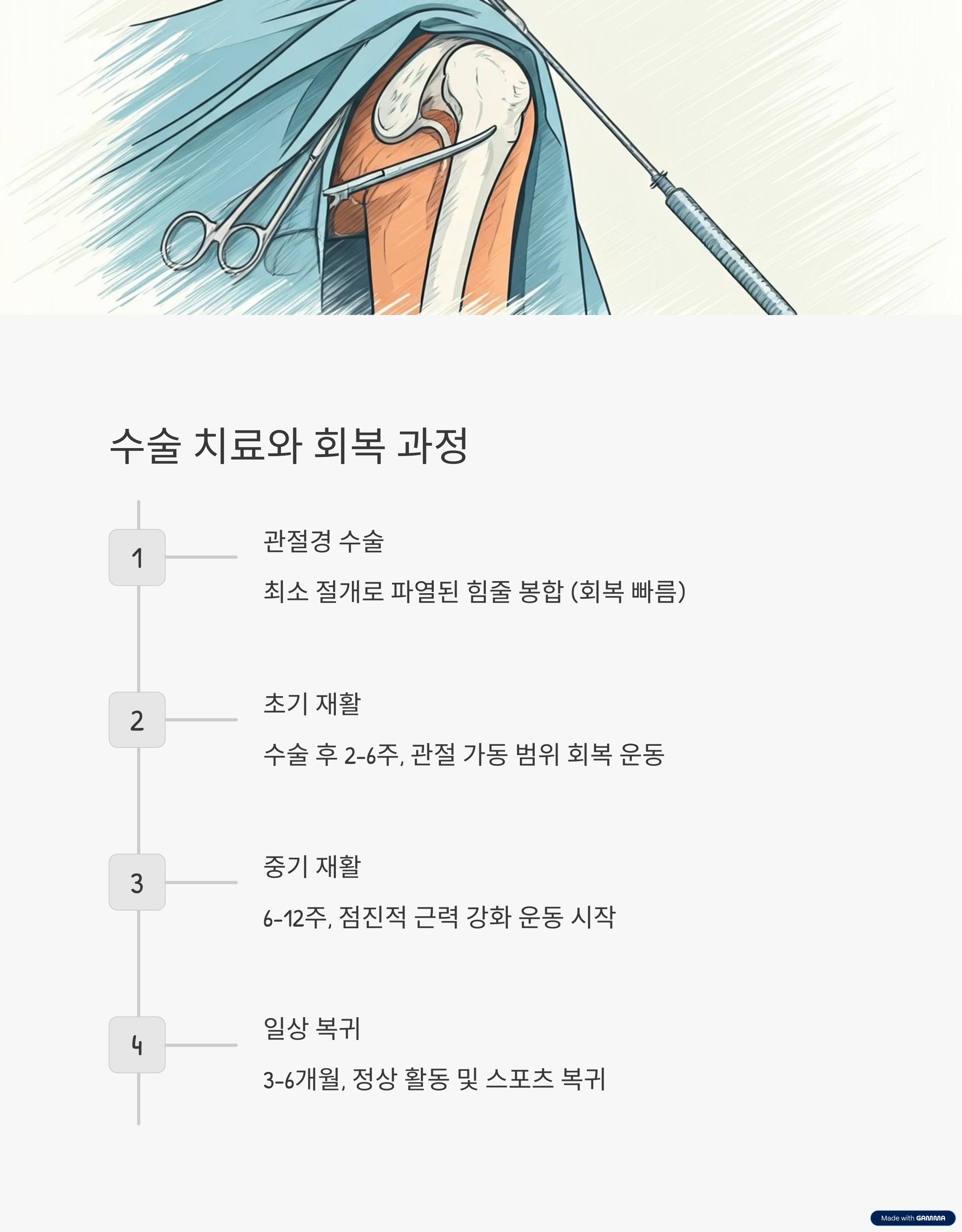 재활은 최소 3개월 이상 걸리며, 무리하면 재파열 위험이 있어요.