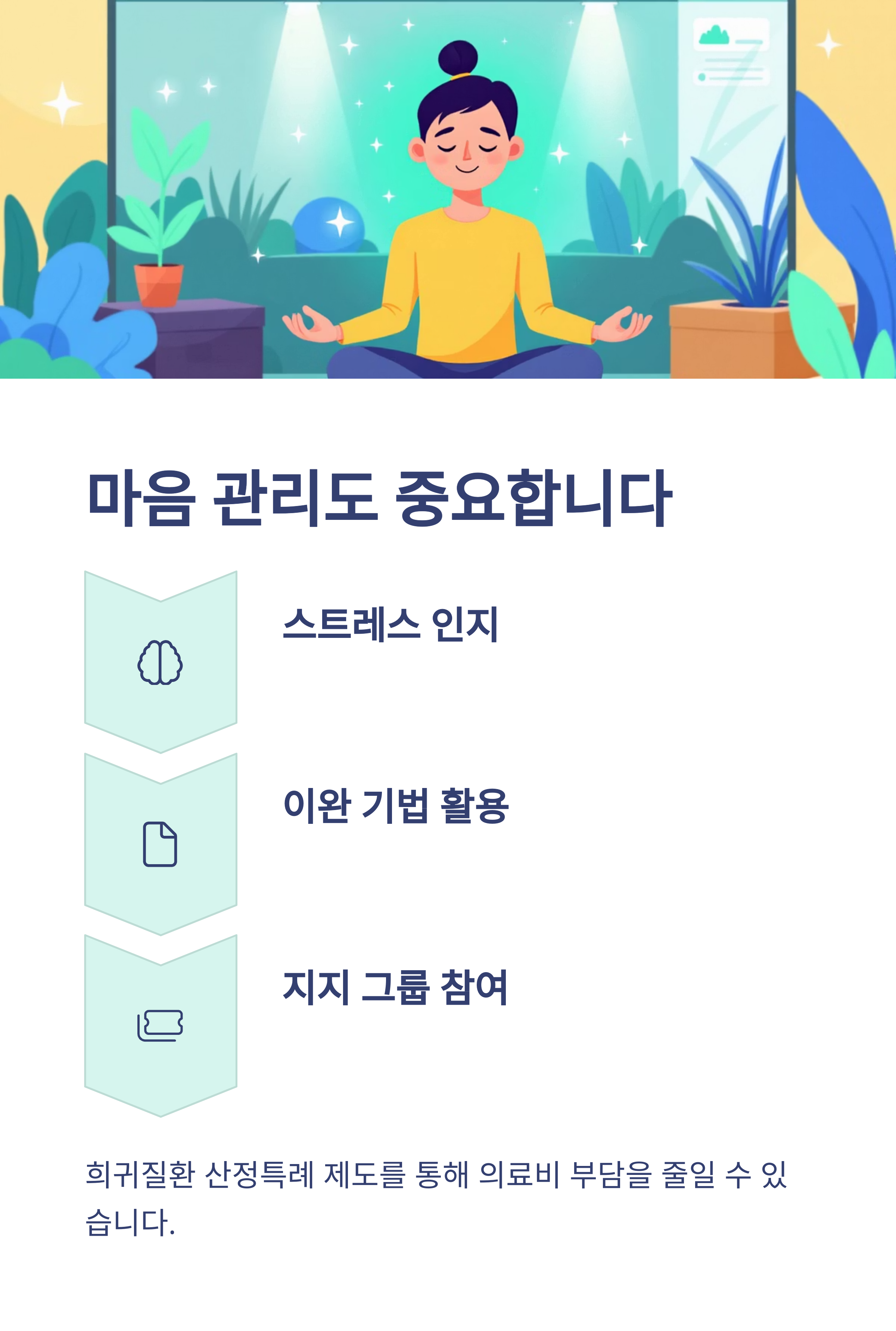 - 희귀난치성 질환 등록 시 의료비 지원 가능