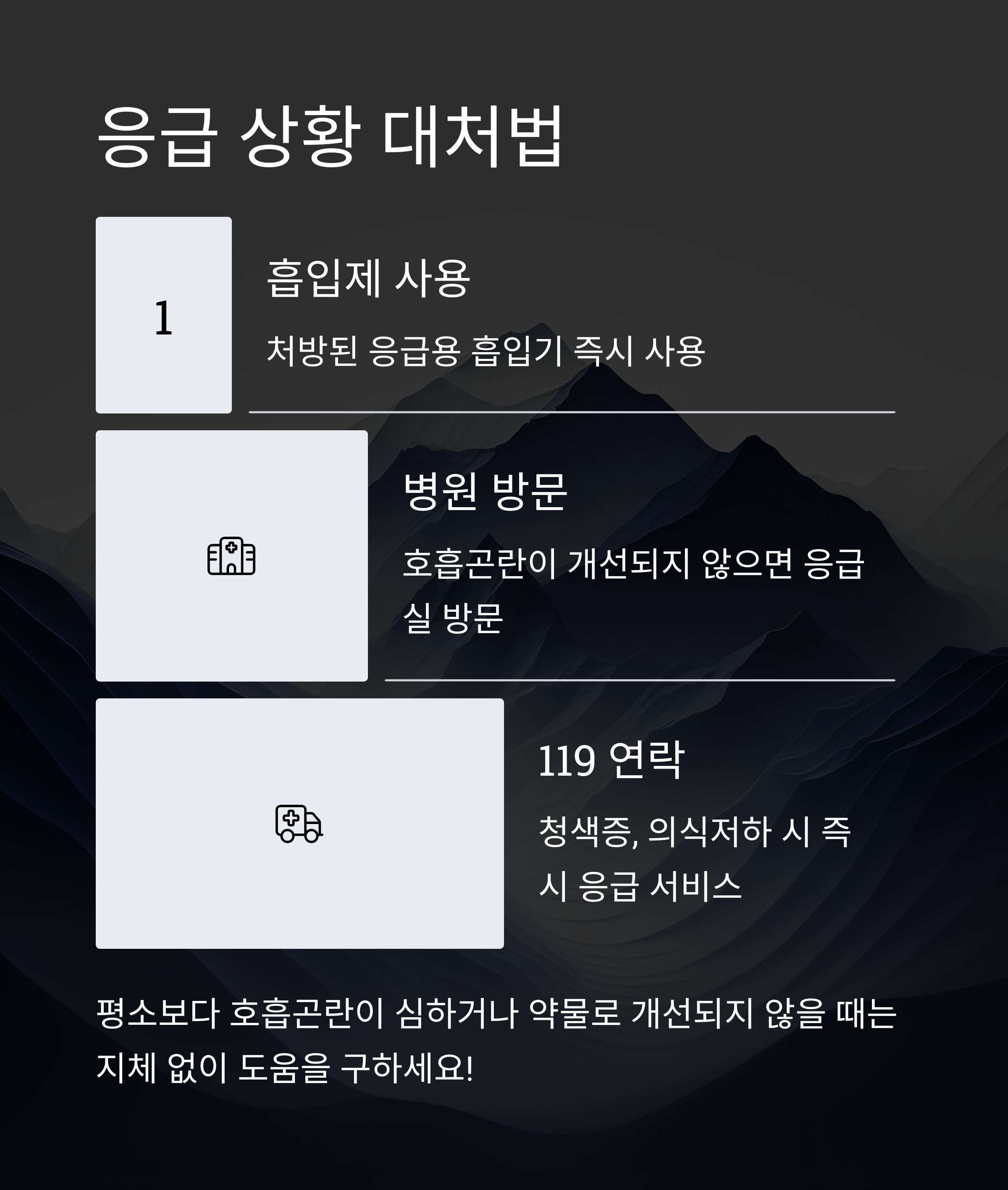 - 흡입제 사용해도 숨쉬기 어렵다면 119 요청
