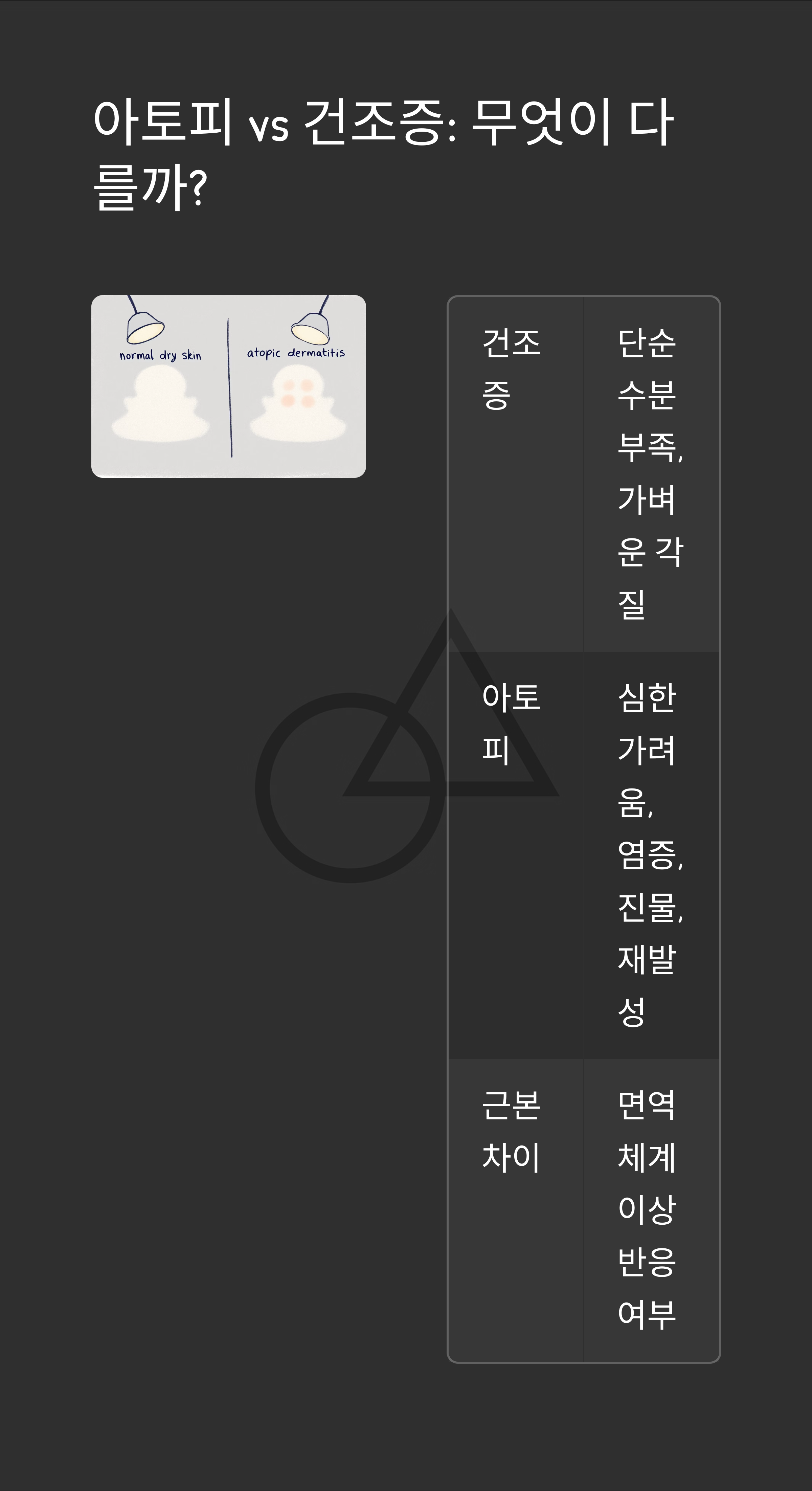 | 원인 | 수분 부족 | 면역 이상 + 피부장벽 손상 |