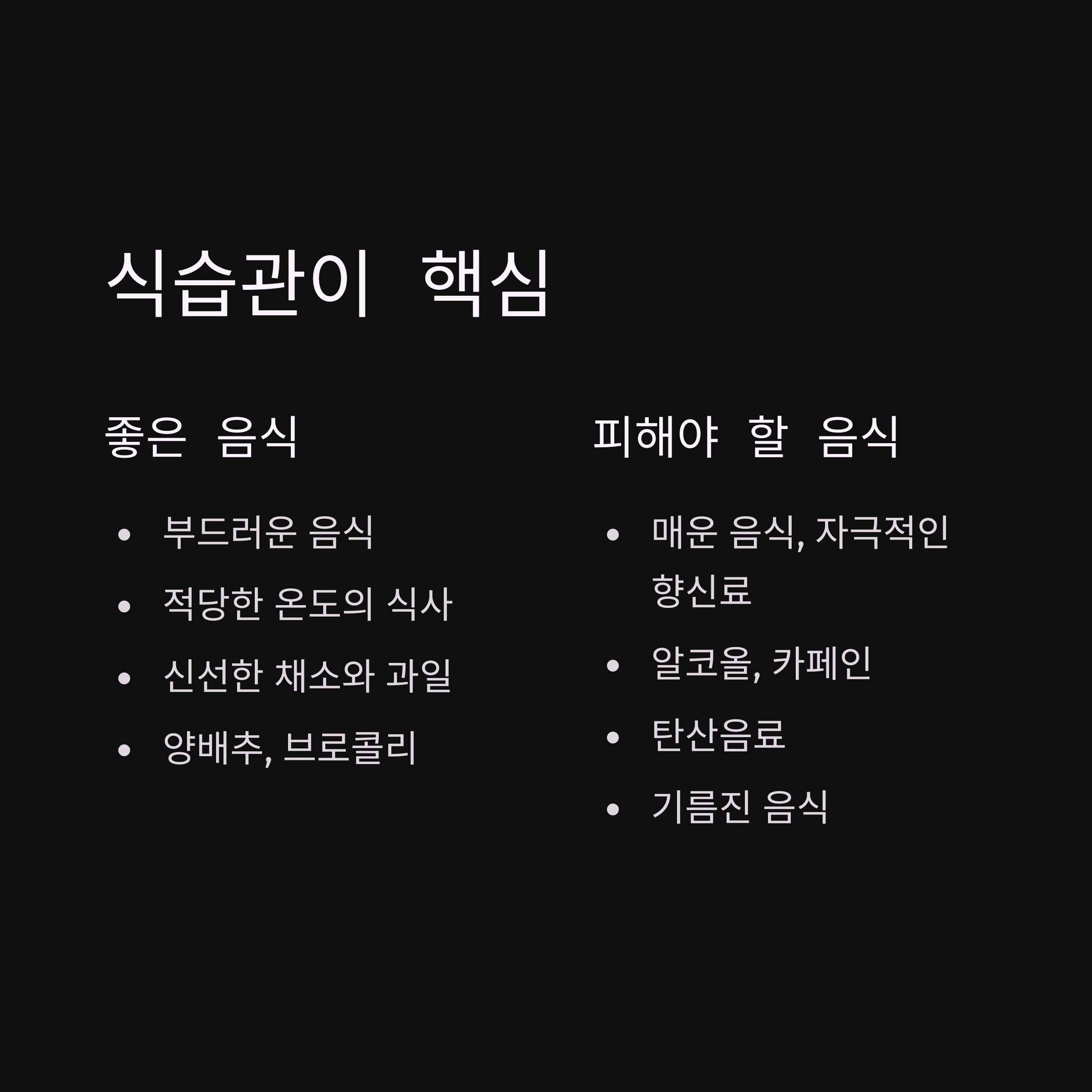 식사 시간, 양, 자극적인 음식 섭취 제한도 병행해야 합니다.