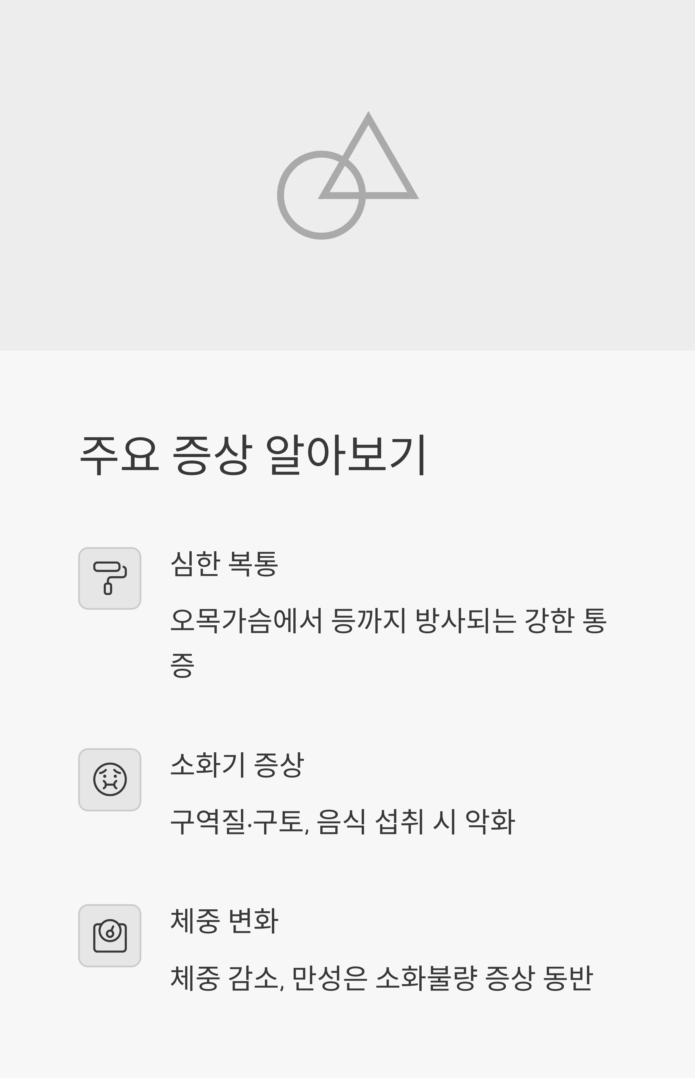 - 명치 부위 중심의 심한 복통 (등으로 방사되기도 함)
