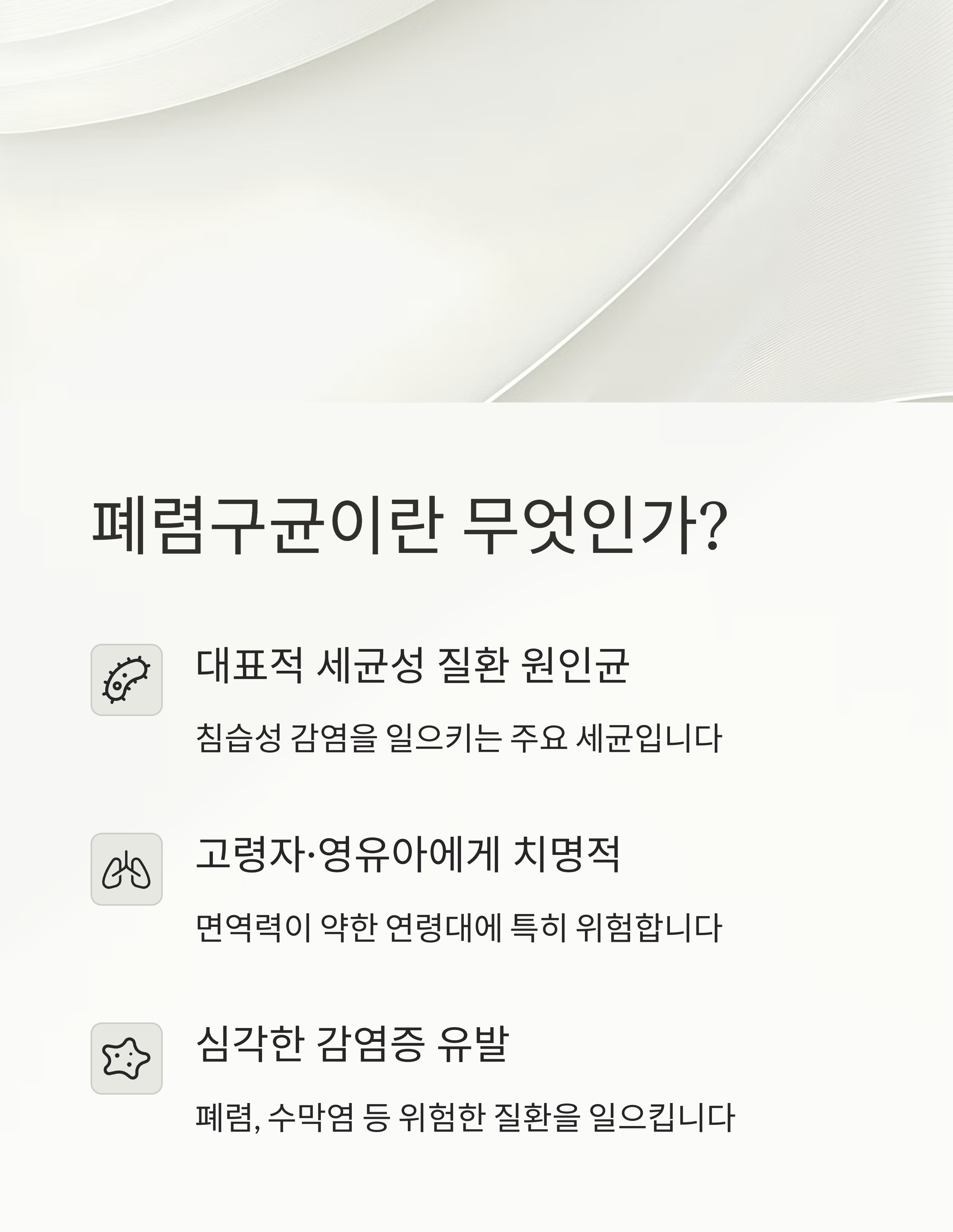 폐렴, 균혈증, 수막염 등 중증 감염을 일으키는 세균입니다.
