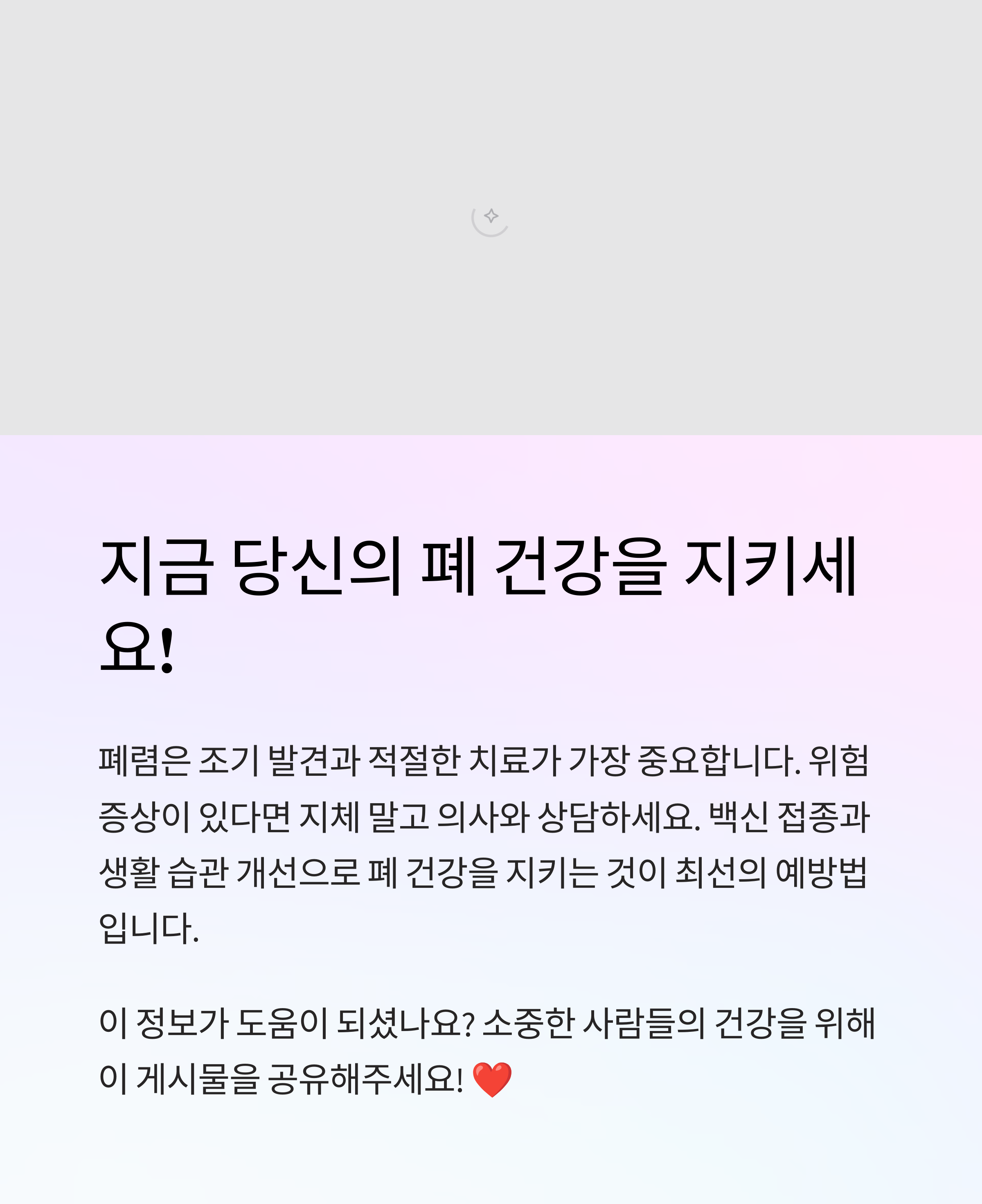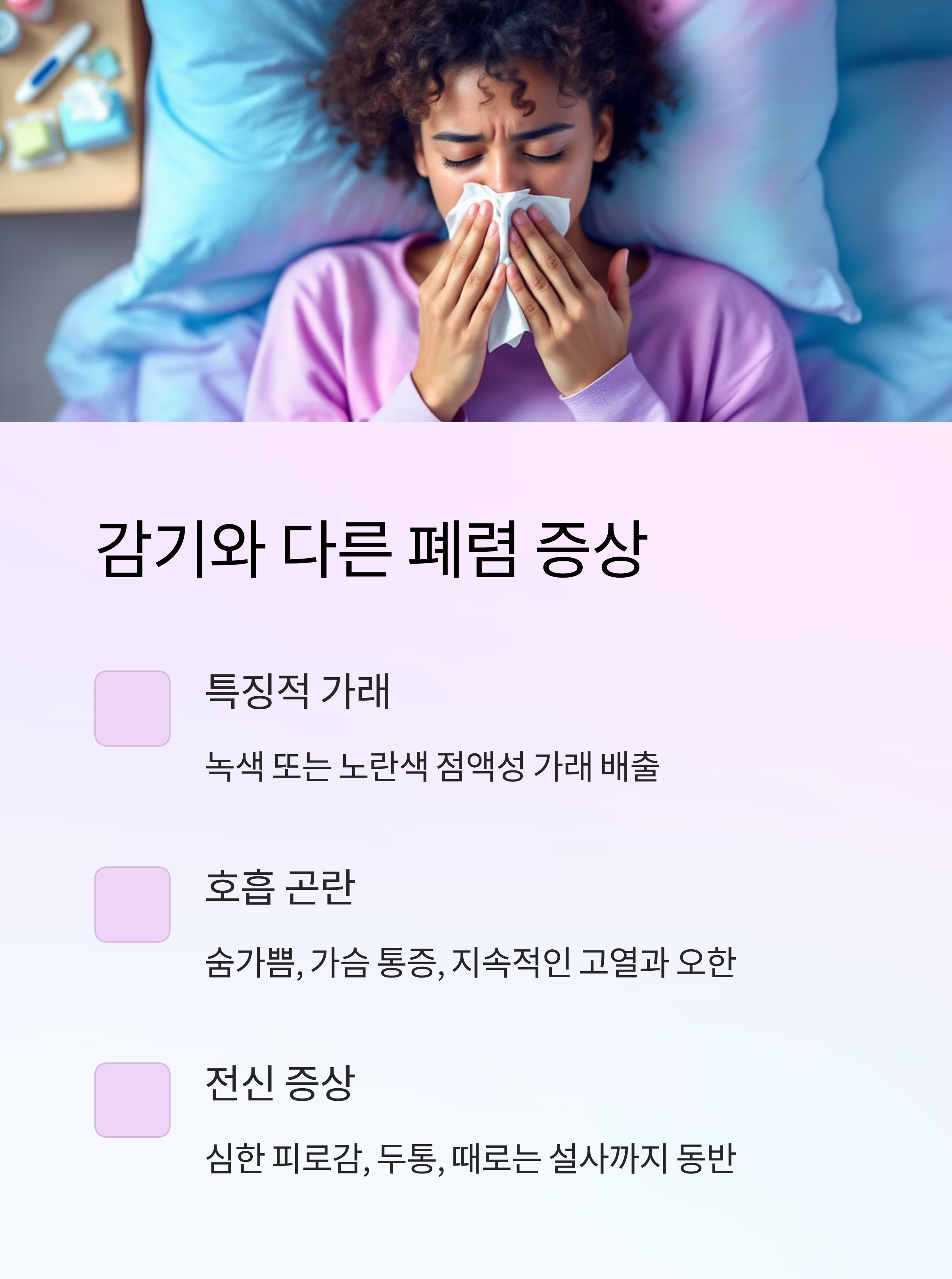 - 폐렴은 고열(38도 이상), 호흡 곤란, 심한 기침, 녹색 가래