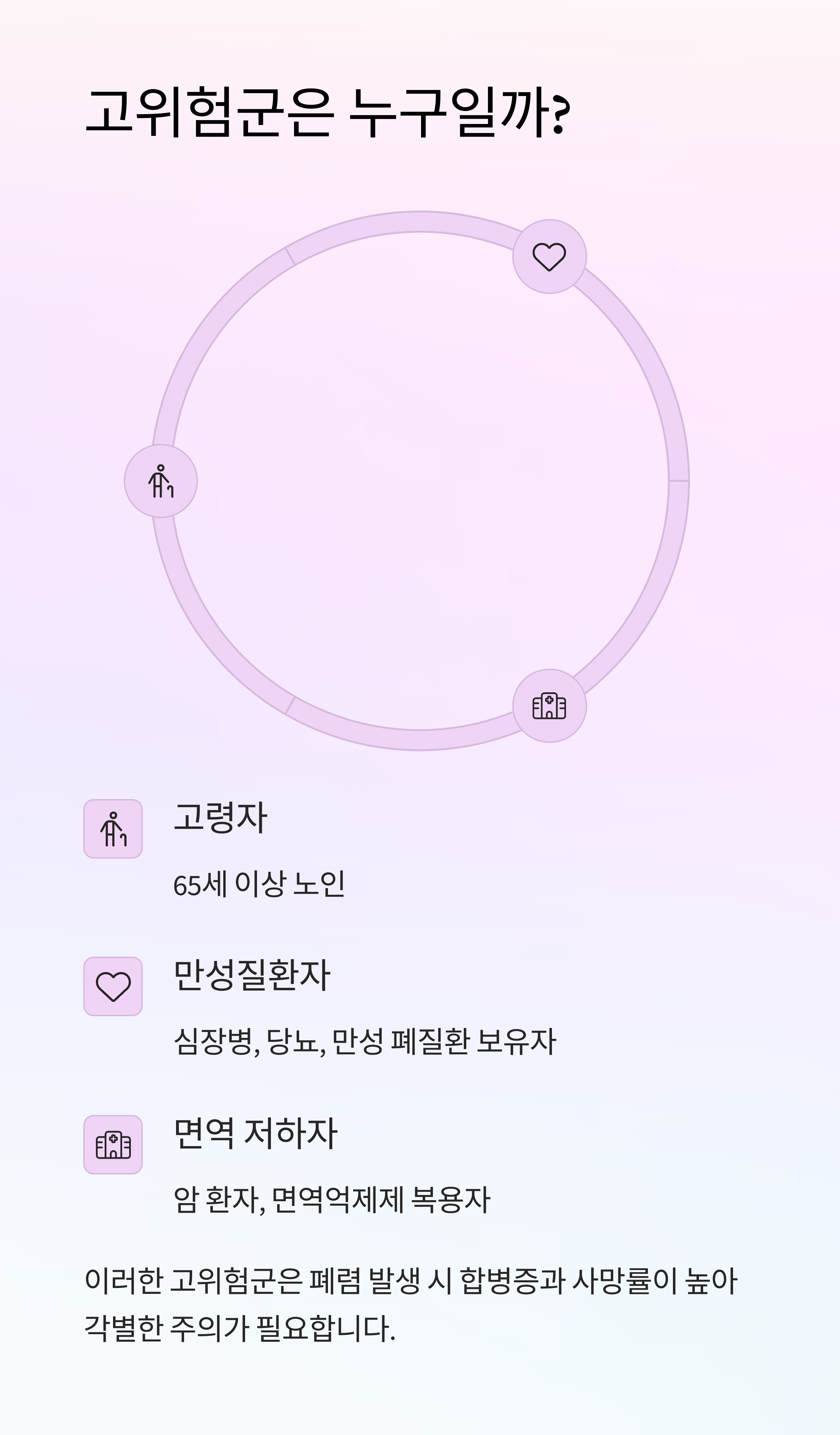 폐렴으로 인한 중증 합병증 위험이 높은 그룹은 다음과 같습니다.