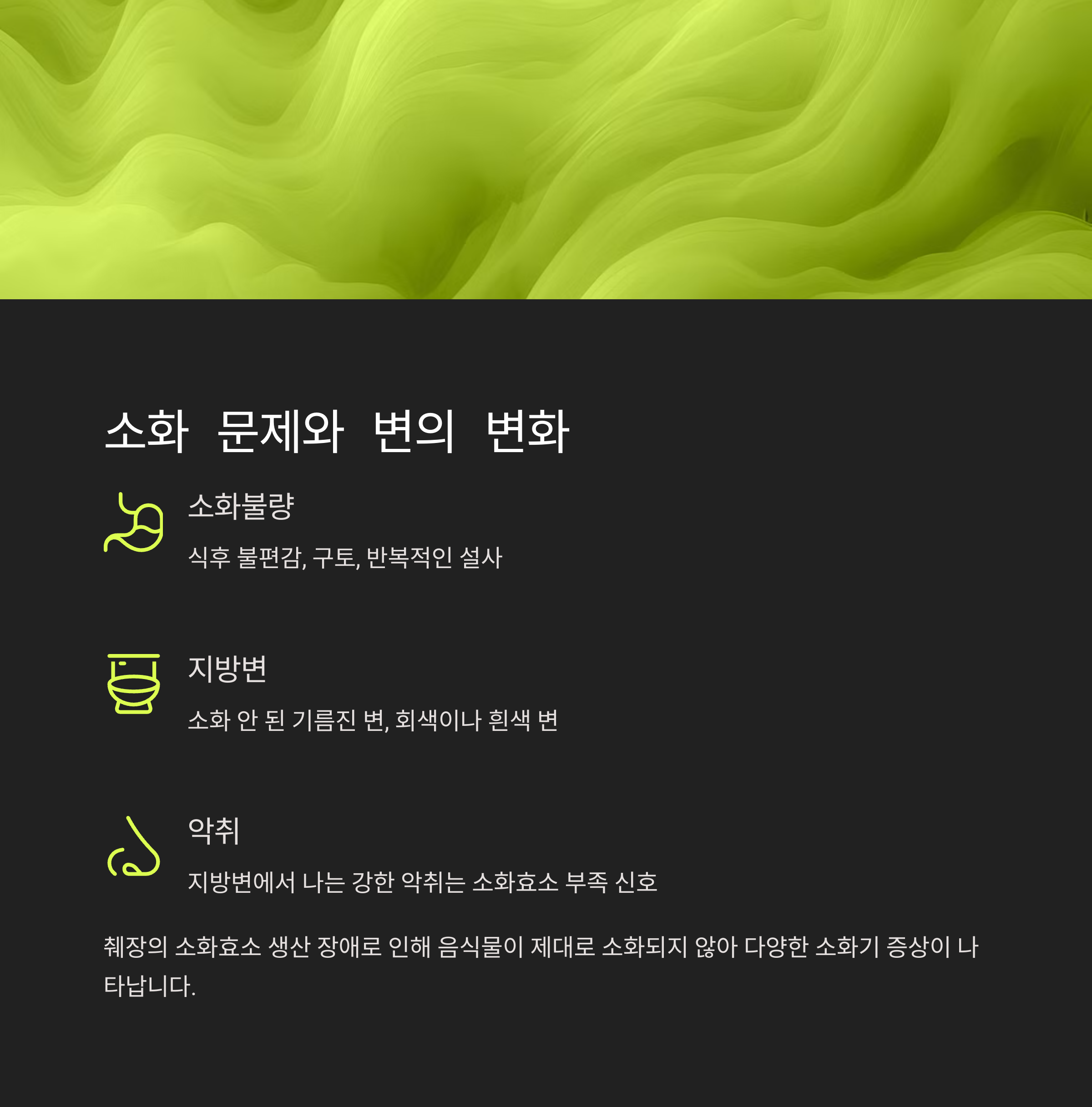 소화불량, 메스꺼움, 지방변의 반복