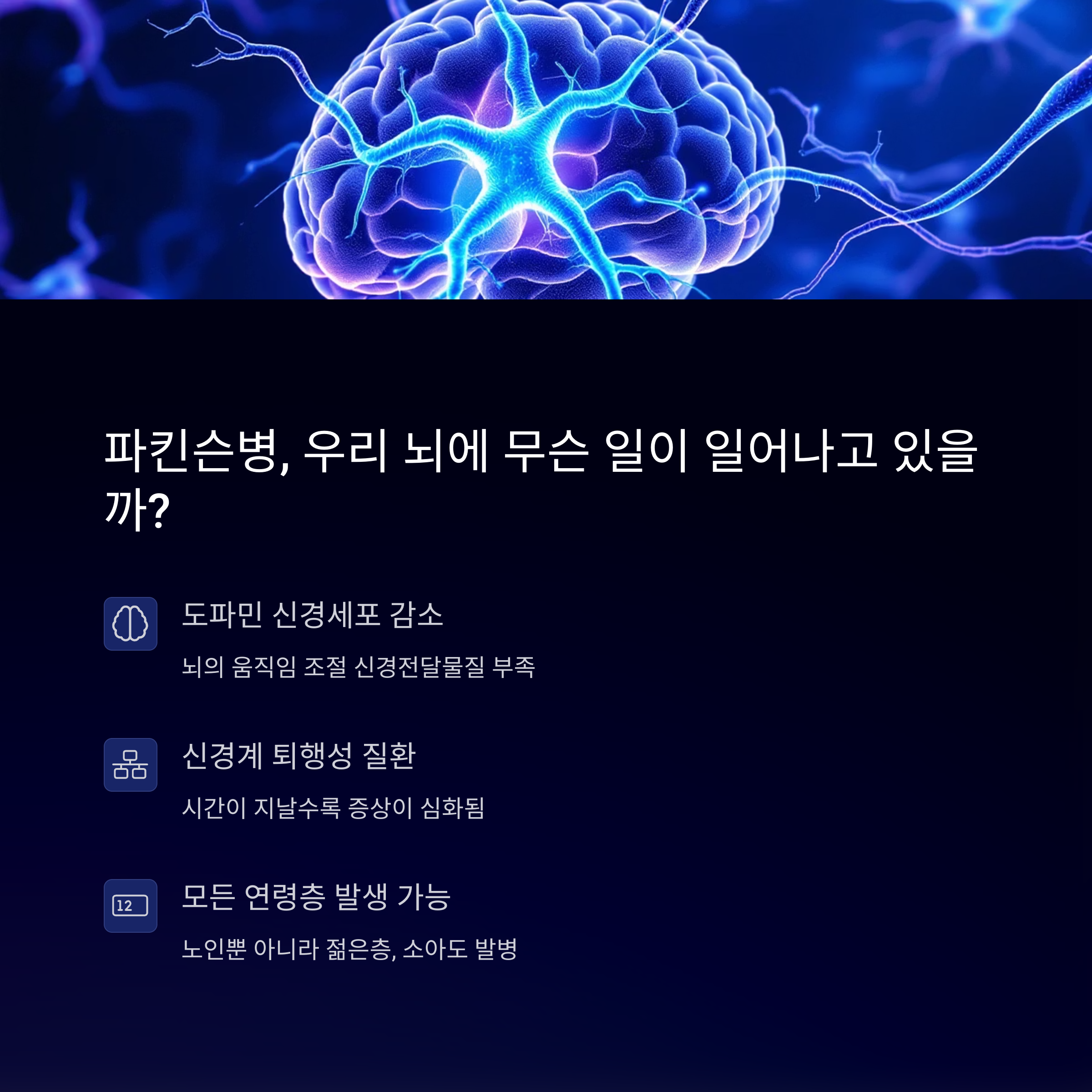 운동 조절에 이상이 생기는 만성 퇴행성 뇌질환입니다