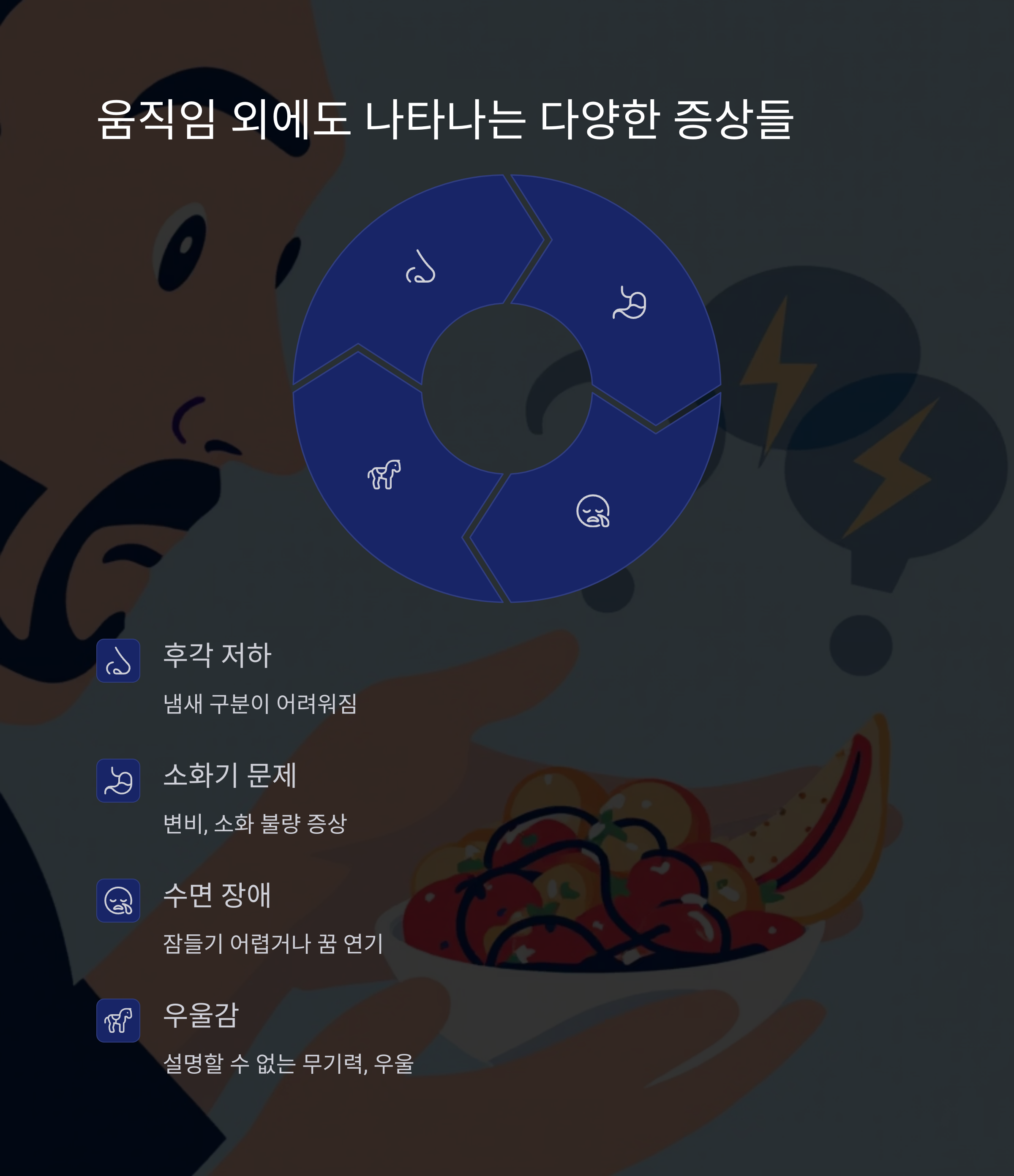 후각 감소, 변비, 수면장애, 우울감 등의 증상을 동반합니다